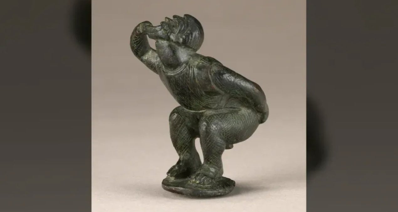 Heykel, birinci ya da ikinci yüzyıla tarihleniyor ve bir sahne kostümüyle çömelmiş, kalçasını dışarı itmiş bir oyuncuyu gösteriyor. Sol eliyle gerisini tutan aktör, sağ eliyle ağzının kenarına iki parmağını yerleştirerek gaz çıkarma sesi yapıyor üzere görünüyor.
