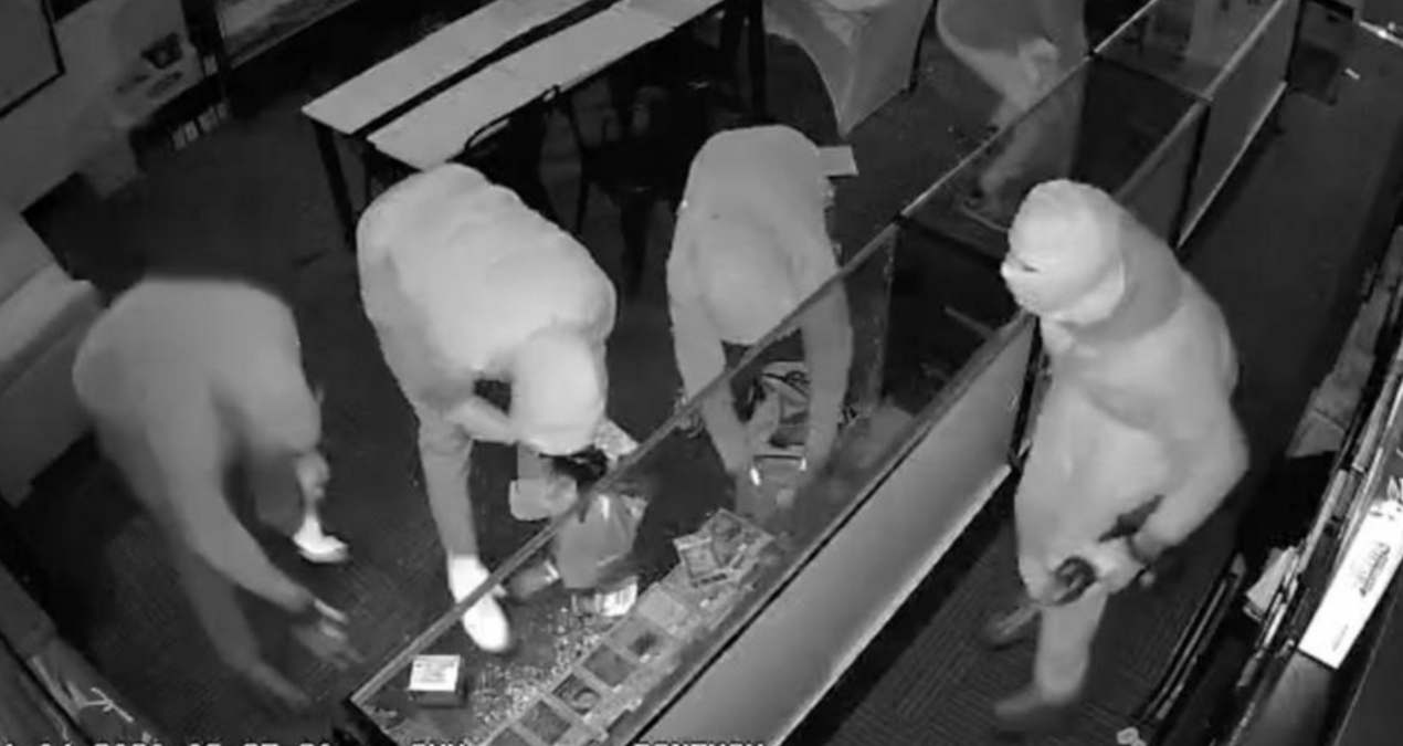 Maskeli beş kuşkulu elektrikli bir testere kullanarak dükkanın kapısını kırmayı başardı. Güvenlik kameralarına yansıyan imajlarda hırsızların çalan alarmlara aldırış etmeden cam vitrinleri parçaladığı görüldü.